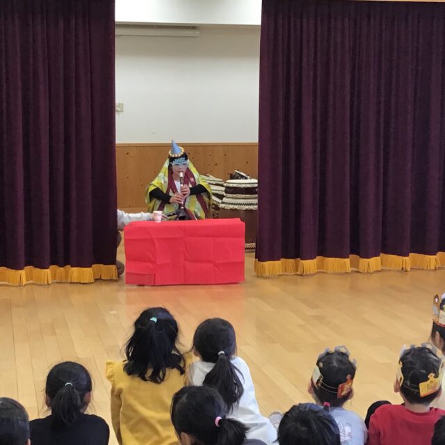 本日は、1月生まれのお友達のお誕生日会を行いました。 7名のお友達がお誕生日を迎えて、堂々とかっこよく入場する事が出来ました! 先生達からのお祝いのメッセージやお友達からのお歌や拍手のプレゼントもしてもらい、嬉しそう姿も見られました。 先生達からの出し物は、二人羽織でした! 帽子を被り、眼鏡をかけて、リコーダーできらきら星を演奏しました。 「面白い」と沢山言ってくれて、真剣に見てくれるこども達でした。 そして、沢山の笑いに包まれて楽しいお誕生日会になりました。