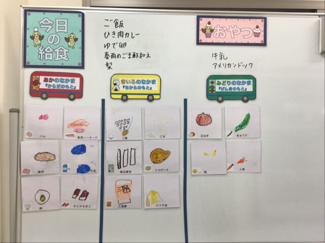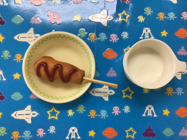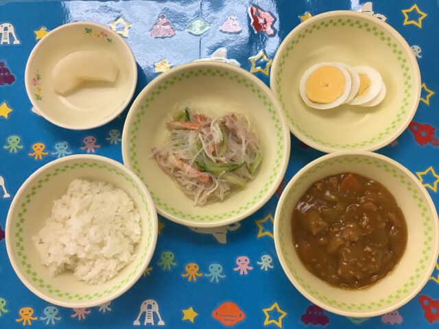 ☆給食・ご飯・ひき肉カレー・ゆで卵・春雨のごま酢和え・梨 ☆おやつ・牛乳・アメリカンドック