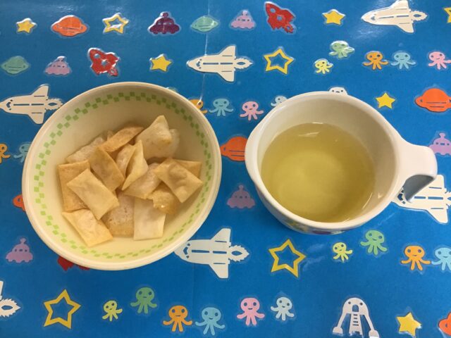 ☆給食・ご飯・ハンペンフライ・野菜炒め・小松菜と豆腐のみそ汁・オレンジ ☆おやつ・リンゴジュース・切り餅あられ