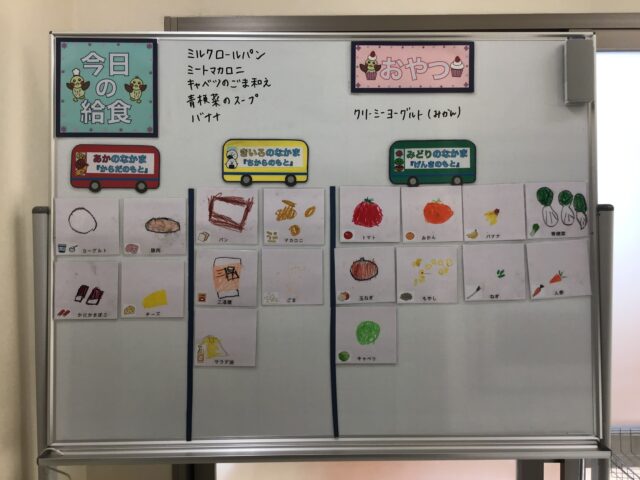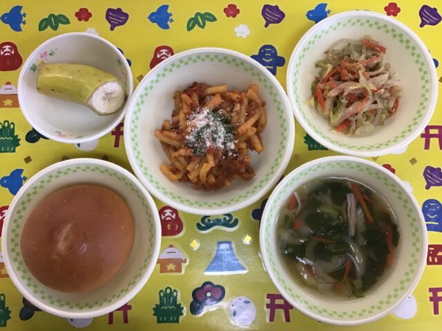 ☆給食・ミルクロールパン・ミートマカロニ・キャベツのごま和え・青梗菜のスープ・バナナ ☆おやつ・クリーミーヨーグルト(みかん)