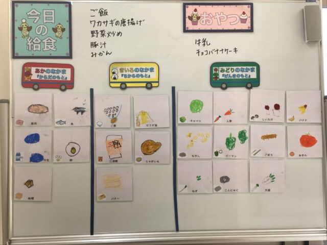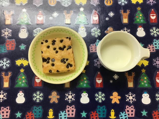 ☆給食・ご飯・ワカサギの唐揚げ・野菜炒め・豚汁・みかん ☆おやつ・牛乳・チョコバナナケーキ