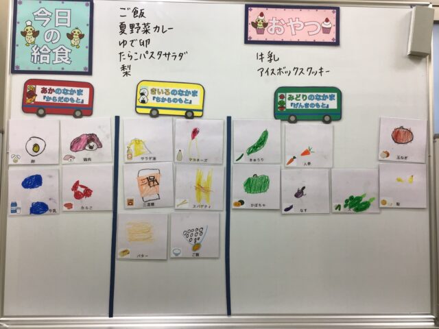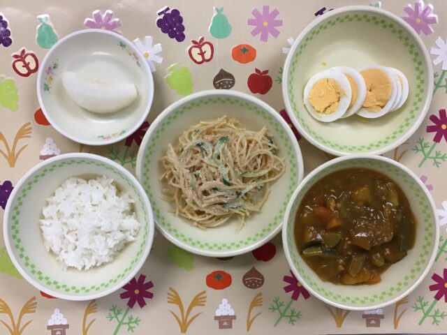 ☆給食・ご飯・夏野菜カレー・ゆで卵・たらこパスタサラダ・梨 ☆おやつ・牛乳・アイスボックスクッキー