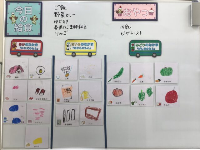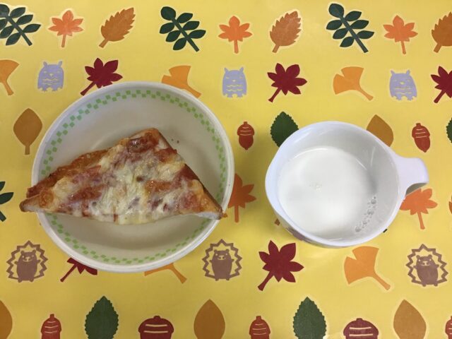 ☆給食・ご飯・野菜カレー・ゆで卵・春雨のごま酢和え・りんご ☆おやつ・牛乳・ピザトースト