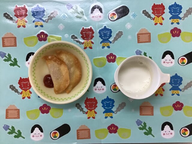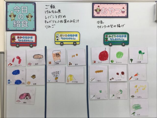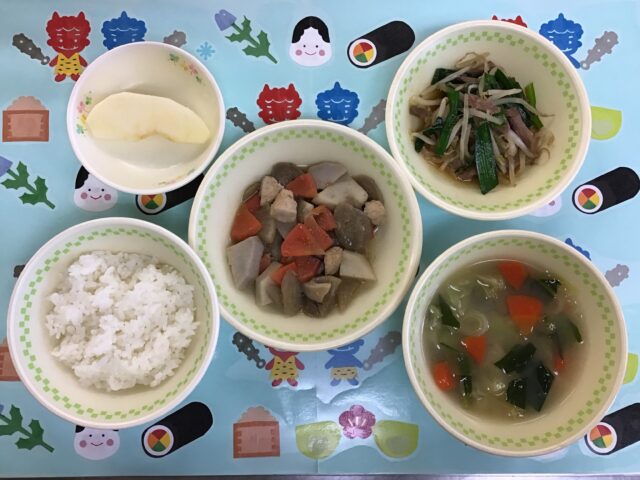 ☆給食・ご飯・けんちん煮・レバニラ炒め・キャベツと小松菜のみそ汁・りんご  ☆おやつ・牛乳・ウインナーの包み揚げ