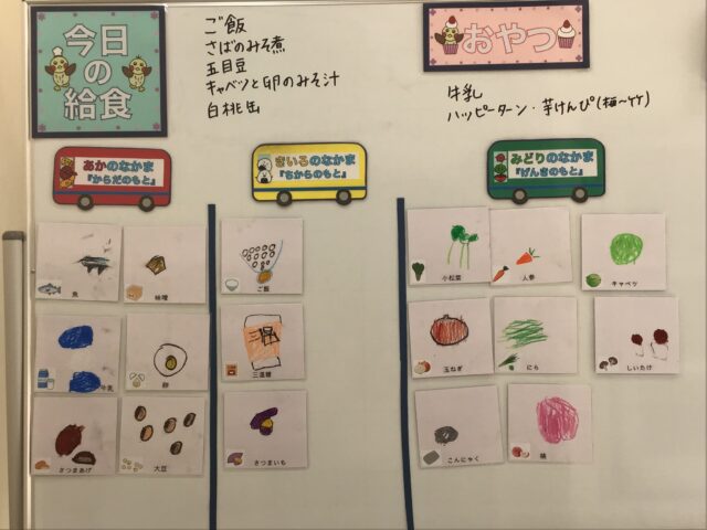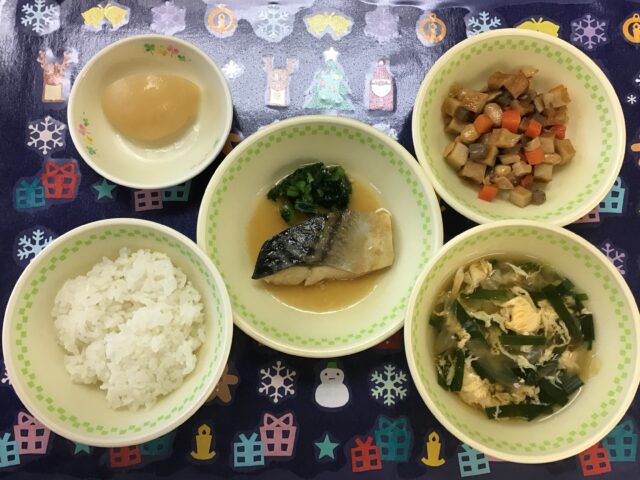 ☆給食・ご飯・さばのみそ煮・五目豆・キャベツと玉ねぎとにらと卵のすまし汁・白桃缶 ☆おやつ・牛乳・ハッピーターン・芋けんぴ