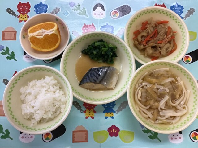 給食・さばのみそ煮・切り干し大根の炒煮・うどん・いよかん ☆おやつ・牛乳・チョコカップケーキ