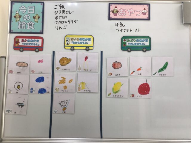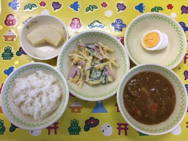 ☆給食・ご飯・ひき肉カレー・ゆで卵・マカロニサラダ・りんご  ☆おやつ・牛乳・ツナマヨトースト