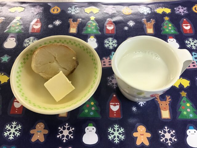 ☆給食・ご飯・ひじき入りハンバーグ・ツナサラダ・大根と豆腐のみそ汁・みかん  ☆おやつ・牛乳・じゃがバター