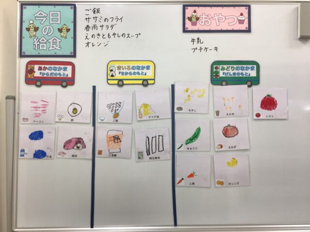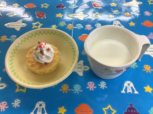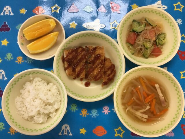 ☆給食・ご飯・ササミのフライ・春雨サラダ・えのきともやしのスープ・オレンジ ☆おやつ・牛乳・プチケーキ