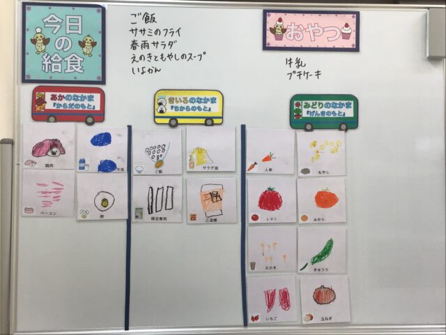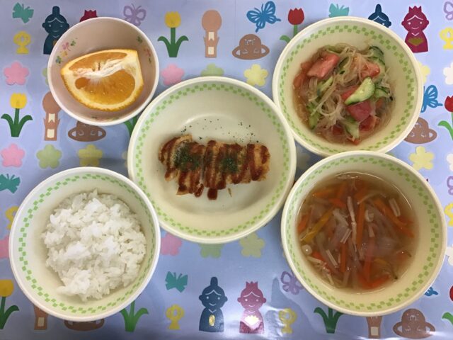 ☆給食・ご飯・ササミのフライ・春雨サラダ・えのきともやしのスープ・いよかん ☆おやつ・牛乳・プチケーキ