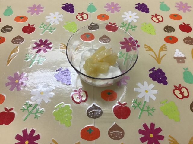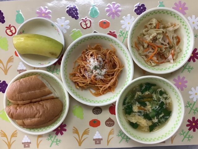 ☆給食・ミルクフランスパン・ツナとトマトのスパゲティ・キャベツのごま和え・青梗菜と卵のスープ・バナナ   ☆おやつ・クリーミーヨーグルト(白桃)