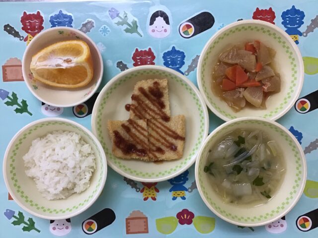 ☆給食・ご飯・ハンペンフライ・根菜の煮付・白菜とわかめのみそ汁・いよかん  ☆おやつ・牛乳・味付けおにぎり