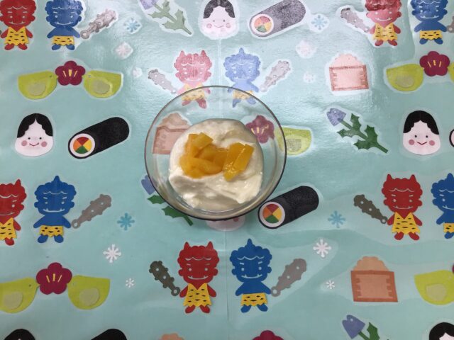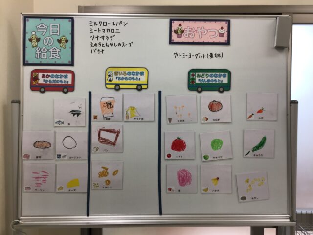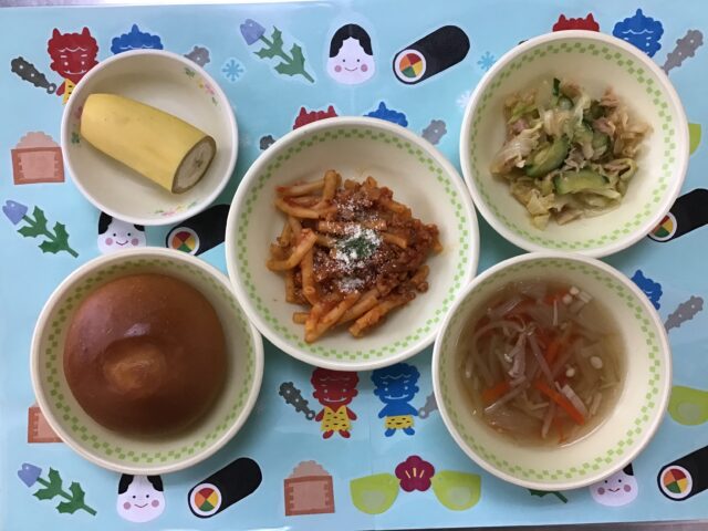 ☆給食・ミルクロールパン・ミートマカロニ・ツナサラダ・えのきともやしのスープ・バナナ ☆おやつ・クリーミーヨーグルト(黄桃)