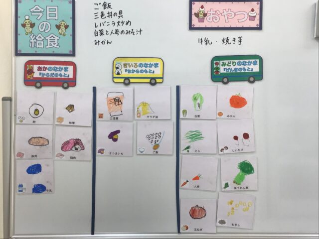 ☆給食・ご飯・三色丼の具・レバニラ炒め・白菜と人参のみそ汁・みかん ☆おやつ・牛乳・焼き芋