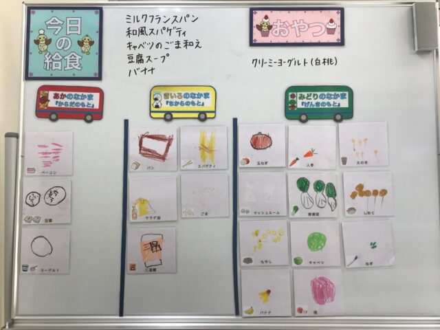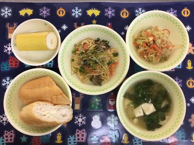 ☆給食・ミルクフランスパン・和風スパゲティ・キャベツのごま和え・豆腐スープ・バナナ ☆おやつ・クリーミーヨーグルト(白桃)