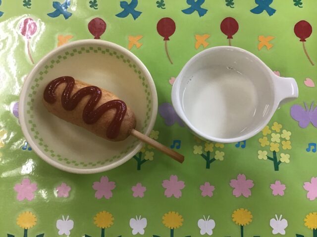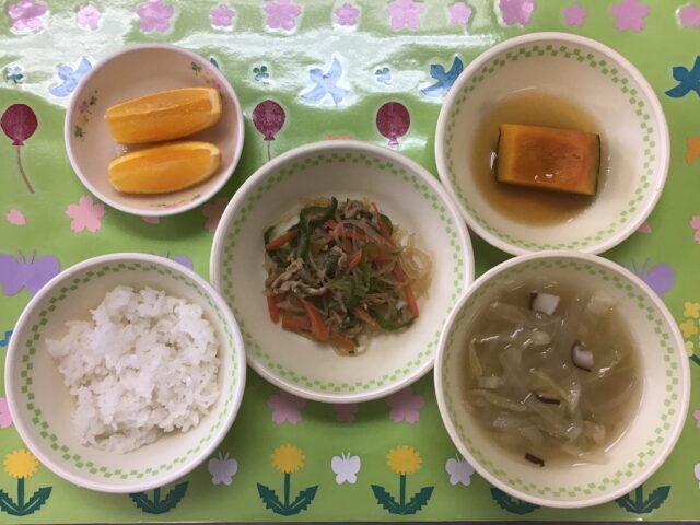 ☆給食・ご飯・豚肉と春雨の炒め・かぼちゃの甘煮・キャベツと玉ねぎのみそ汁・オレンジ ☆おやつ・牛乳・アメリカンドック