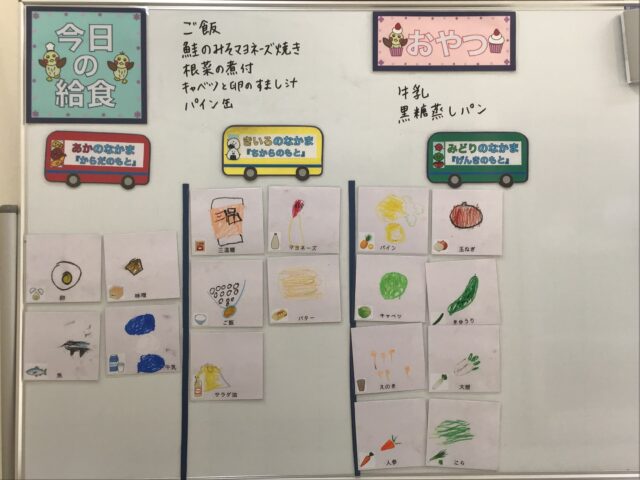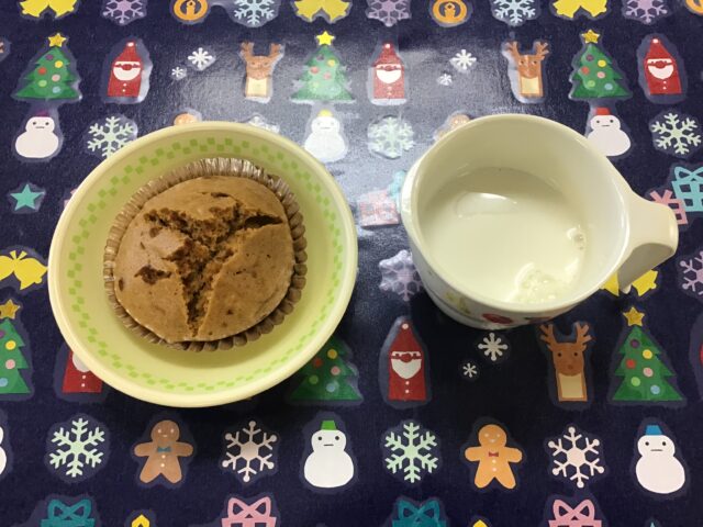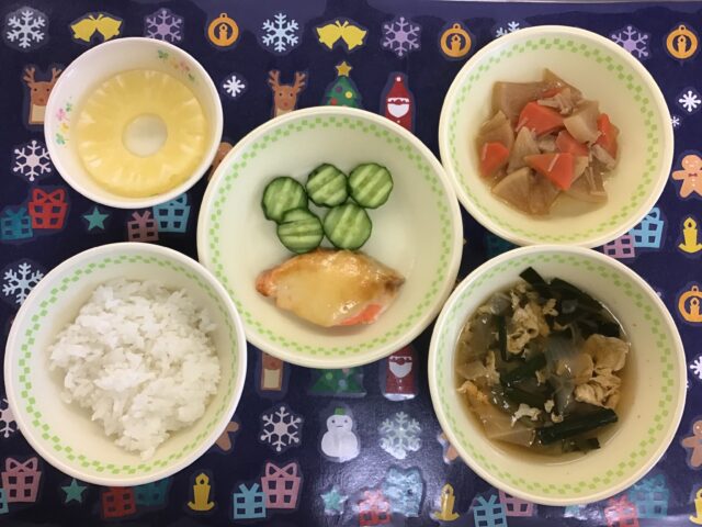 ☆給食・ご飯・鮭のみそマヨネーズ焼き・根菜の煮付け・キャベツと玉ねぎとにらと卵のすまし汁・パイン缶 ☆おやつ・牛乳・黒糖蒸しパン