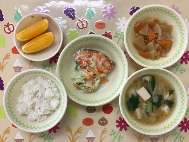 ☆給食・ご飯・鮭のマリネ風・根菜の煮付・豆腐と小松菜のみそ汁・オレンジ  ☆おやつ・牛乳・チーズケーキ