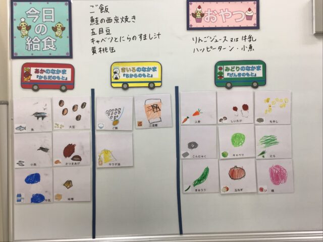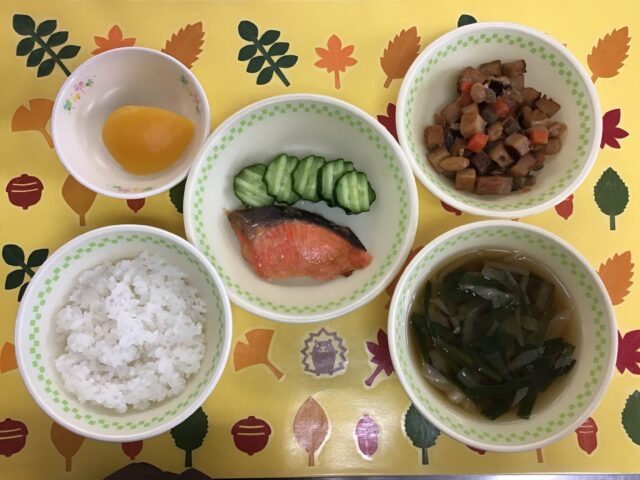 ☆給食・ご飯・鮭の西京焼き・五目豆・キャベツとにらのすまし汁・黄桃缶 ☆おやつ・りんごジュース又は牛乳・ハッピーターン・小魚