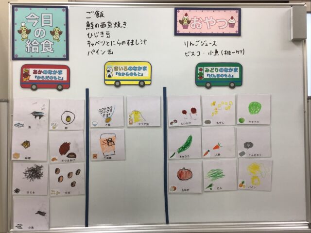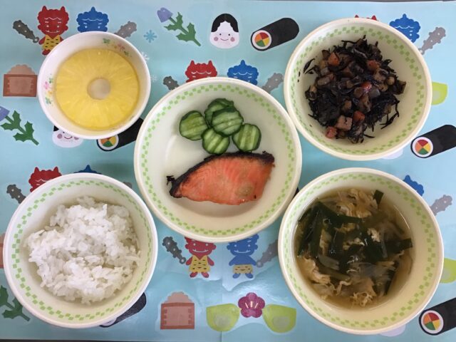 ☆給食・ご飯・鮭の西京焼き・ひじき豆・キャベツとにらのすまし汁・パイン缶 ☆おやつ・りんごジュース・ビスコ・小魚(桃〜竹)