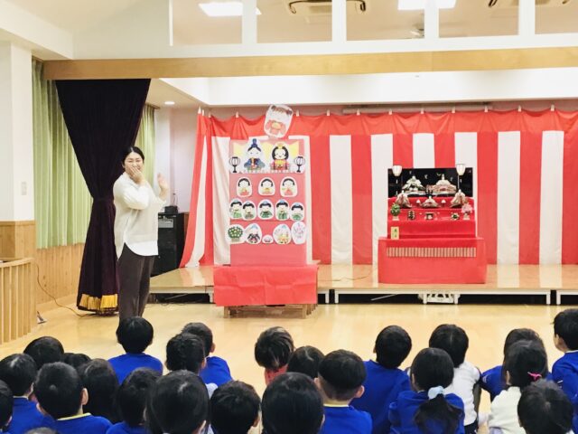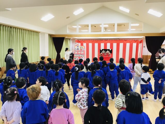 ホールに3・4・5歳児が集まり、ひな祭りの由来についての出し物を見たり、みんなで「うれしいひなまつり」を歌ったりして、伝統的な行事に親しみました。出し物では、クイズ形式で答える場面もあり、こども達は元気よく手を挙げて大盛り上がり!!
