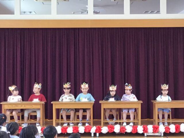 みんなからの大きな拍手の中、冠をかぶってキラキラ笑顔で登場してくれたお友だち。クラスの先生から紹介と、お祝いの言葉をいただきました。お友だちからもたくさんの拍手と「おめでとう!」の声が贈られ、嬉しそうにしていました。インタビューにも大きな声で答えてくれました。